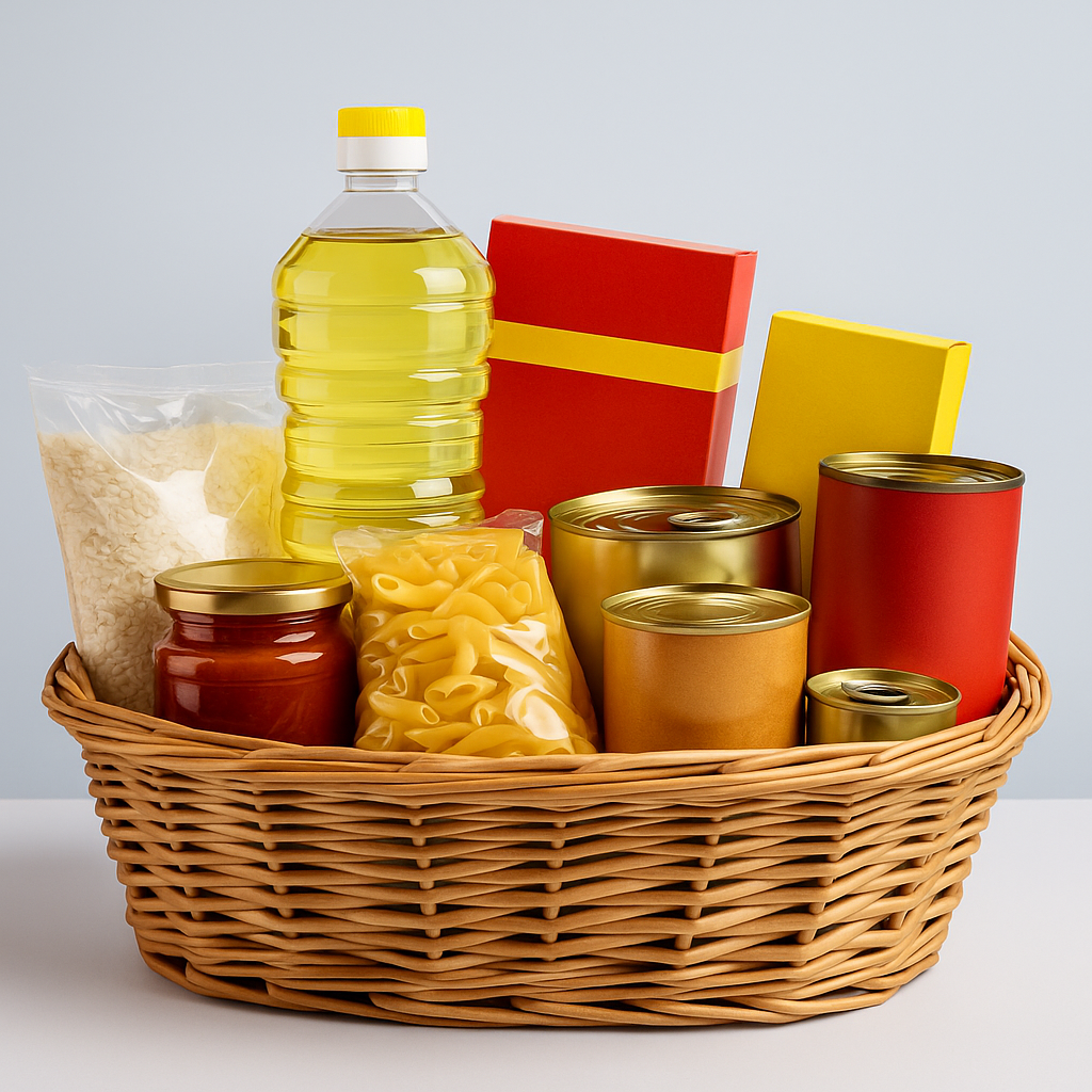 - سلة كبيرة: تضم منتجات إضافية مثل دجاج مجمد أو لحم معلب، وعصائر.