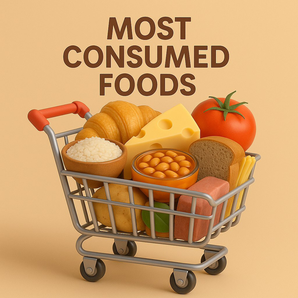 عندما نتحدث عن أكثر الأغذية شعبية واستهلاكًا، فإن القائمة تضم الحبوب، اللحوم، الزيوت، السكر، الحليب، الخضروات، الفواكه، الملح، البقوليات، والبيض. هذه المواد تشكل الأساس للوجبات اليومية في معظم ثقافات العالم.