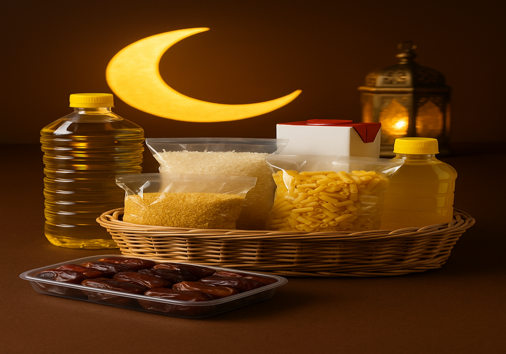 - 🥫 Ramadan essentials : rice, flour, sugar, oil, and dates.